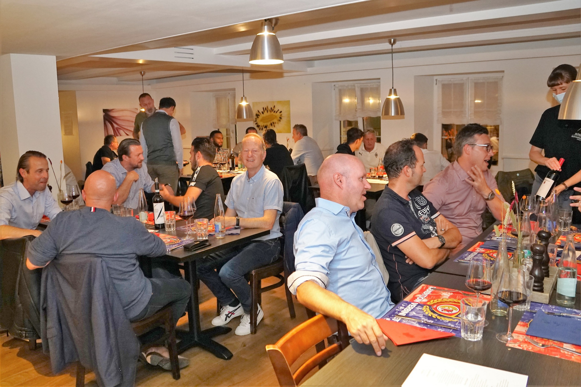 Die IG des SC Cham lud nach einem durch Corona erzwungenen Unterbruch von einem Jahr wieder zur traditionellen Tavolata zu Markus Stoller ins Rössli Cham. Der Einladung folgten 75 geladene Gäste, darunter die Erste Mannschaft mit ihrem Staff, das Trainerteam der Zweiten Mannschaft, Sponsoren und Gönner der Sponsorenorganisation Interessensgemeinschaft SC Cham (IG) sowie langjährige verdiente Funktionäre. Mit von der Partie waren die «drei Weisen» des SC Cham, Teammanager Walter Riedweg und Hardy Werder mit ihren Gemahlinnen sowie Roli Köpfli. Und als spezieller Gast überraschte der Restaurantkritiker und ehemalige Schweizer Spitzenkoch Daniel Bumann die illustre Schar mit einem Kurzreferat und der Möglichkeit, ihm Fragen stellen zu können. Durch den bestens organisierten Abend führten die beiden neuen Co-Präsidenten der IG, Thomas Riedweg und Philipp Suter.